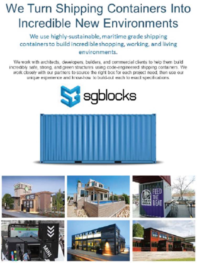 SGB is in the business of modifying cargo shipping containers for use in construction. SGB takes existing steel shipping containers and repurposes them into modules that can be stacked, arranged, or configured to fit any construction application. The use of these repurposed shipping containers, which we refer to as “SG BlocksTM,” allows owners design flexibility and greater construction efficiency than traditional methods of construction. SG BlocksTM also have a particular application in meeting safe and sustainable housing needs, especially in hurricane- and earthquake-prone areas.