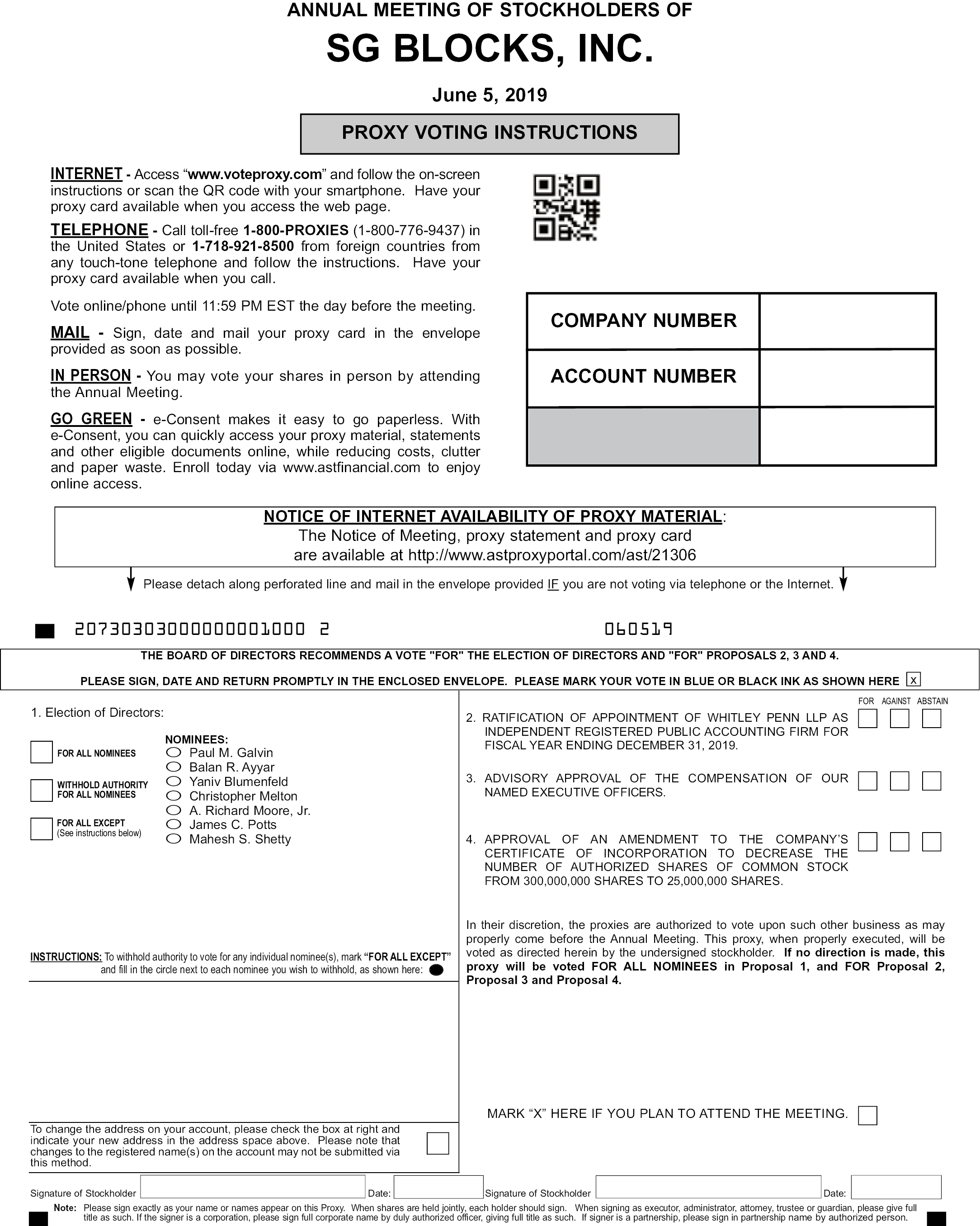 Important Notice Regarding the Availability of Proxy Materials for the Annual Meeting to be held on June 5, 2019: In accordance with the rules of the Securities and Exchange Commission (the “SEC”), we are advising our stockholders of Internet availability of our proxy materials related to the Annual Meeting. SEC rules allow companies to provide access to proxy materials in one of two ways. Because we have elected to use the “full set delivery” option, we are delivering our proxy materials to our stockholders by providing paper copies, as well as providing access to our proxy materials on a publicly accessible website. Our proxy statement, proxy card, Annual Report on Form 10-K for the year ended December 31, 2018 and this notice are available at www.sgblocks.com or www.astproxyportal.com/ast/21306.