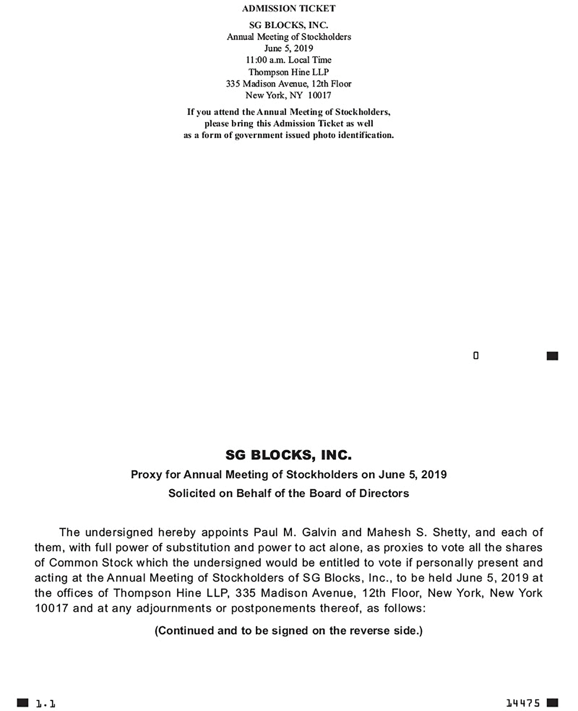 The 2019 Annual Meeting of Stockholders (the “Annual Meeting”) of SG Blocks, Inc., a Delaware corporation (the “Company”), will be held on Wednesday, June 5, 2019, at 11:00 a.m., at the offices of Thompson Hine LLP (“Thompson Hine”), 335 Madison Avenue, 12th Floor, New York, New York, for the following purposes: