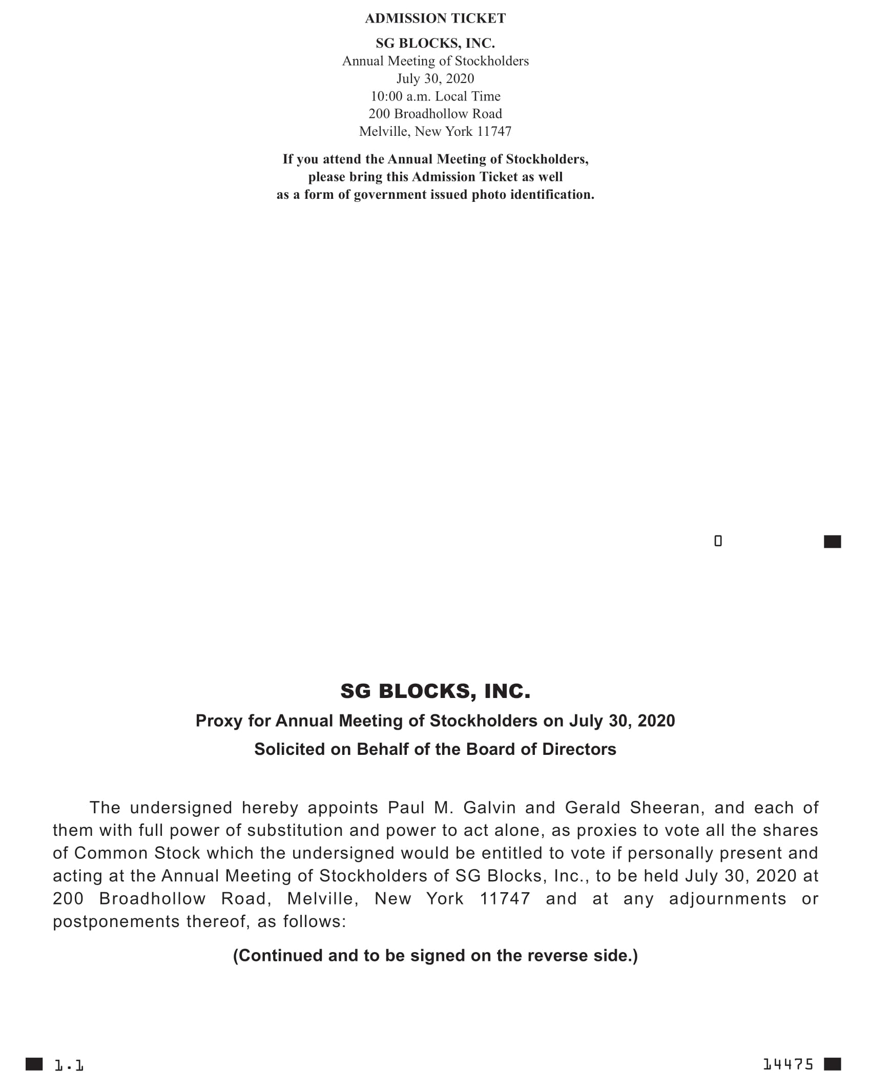 We are providing these proxy materials to holders of shares of common stock, $0.01 par value per share (“Common Stock”), of SG Blocks, Inc., a Delaware corporation (referred to as “SG Blocks,” the “Company,” “we,” or “us”), in connection with the solicitation by the Board of Directors of SG Blocks (the “Board” or “Board of Directors”) of proxies to be voted at our 2020 Annual Meeting of Stockholders (the “2020 Annual Meeting” or “Annual Meeting”) to be held at 200 Broadhollow Road, Melville, New York 11747, on July 30, 2020, beginning at 10:00 a.m., local time, and at any adjournment or postponement of our 2020 Annual Meeting.