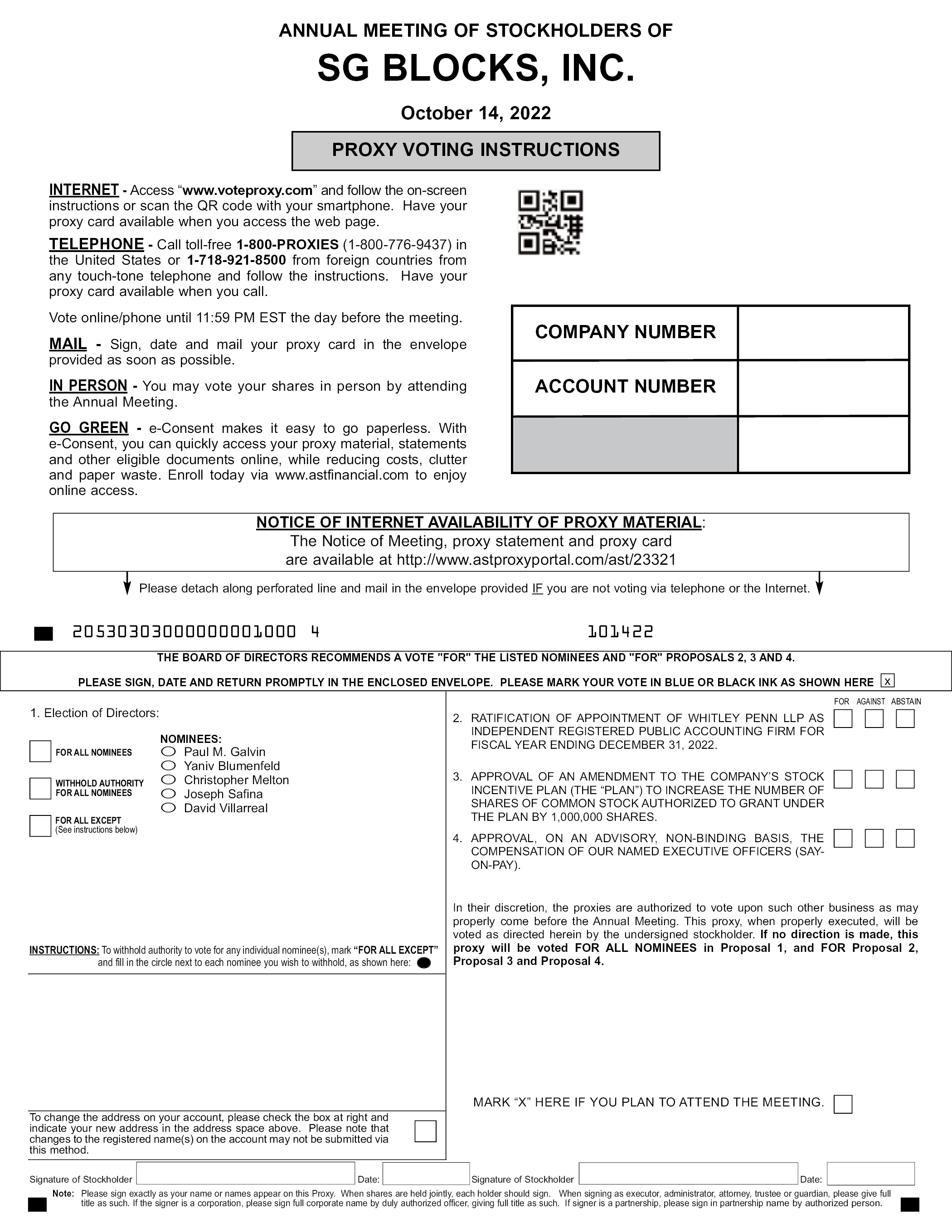 ANNUAL MEETING OF STOCKHOLDERS OF SG BLOCKS, INC. October 14, 2022 GO GREEN e-Consent makes it easy to go paperless. With e-Consent, you can quickly access your proxy material, statements and other eligible documents online, while reducing costs, clutter and paper waste. Enroll today via www.astfinancial.com to enjoy online access. NOTICE OF INTERNET AVAILABILITY OF PROXY MATERIAL: The Notice of Meeting, proxy statement and proxy card are available at http://www.astproxyportal.com/ast/23321 Please sign, date and mail your proxy card in the envelope provided as soon as possible. Please detach along perforated line and mail in the envelope provided. 20530303000000001000 4 101422 THE BOARD OF DIRECTORS RECOMMENDS A VOTE “FOR” THE LISTED NOMINEES AND “FOR” PROPOSALS 2, 3 AND 4. PLEASE SIGN, DATE AND RETURN PROMPTLY IN THE ENCLOSED ENVELOPE. PLEASE MARK YOUR VOTE IN BLUE OR BLACK INK AS SHOWN HERE Election of Directors: NOMINEES: FOR ALL NOMINEES WITHHOLD AUTHORITY FOR ALL NOMINEES FOR ALL EXCEPT (See instructions below) Paul M. Galvin Yaniv Blumenfeld Christopher Melton Joseph Safina David Villarreal FOR AGAINST ABSTAIN 2. RATIFICATION OF APPOINTMENT OF WHITLEY PENN LLP AS INDEPENDENT REGISTERED PUBLIC ACCOUNTING FIRM FOR FISCAL YEAR ENDING DECEMBER 31, 2022. 3. APPROVAL OF AN AMENDMENT TO THE COMPANY’S STOCK INCENTIVE PLAN (THE “PLAN”) TO INCREASE THE NUMBER OF SHARES OF COMMON STOCK AUTHORIZED TO GRANT UNDER THE PLAN BY 1,000,000 SHARES. 4. APPROVAL, ON AN ADVISORY, NON-BINDING BASIS, THE COMPENSATION OF OUR NAMED EXECUTIVE OFFICERS (SAYON-PAY). In their discretion, the proxies are authorized to vote upon such other business as may properly come before the Annual Meeting. This proxy, when properly executed, will be voted as directed herein by the undersigned stockholder. If no direction is made, this proxy will be voted FOR ALL NOMINEES in Proposal 1, and FOR Proposal 2, Proposal 3 and Proposal 4. INSTRUCTIONS: To withhold authority to vote for any individual nominee(s), mark “FOR ALL EXCEPT” and fill in the circle next to each nominee you wish to withhold, as shown here: To change the address on your account, please check the box at right and indicate your new address in the address space above. Please note that changes to the registered name(s) on the account may not be submitted via this method. MARK “X” HERE IF YOU PLAN TO ATTEND THE MEETING. Signature of Stockholder Date: Signature of Stockholder Date: Note: Please sign exactly as your name or names appear on this Proxy. When shares are held jointly, each holder should sign. When signing as executor, administrator, attorney, trustee or guardian, please give full title as such. If the signer is a corporation, please sign full corporate name by duly authorized officer, giving full title as such. If signer is a partnership, please sign in partnership name by authorized person.