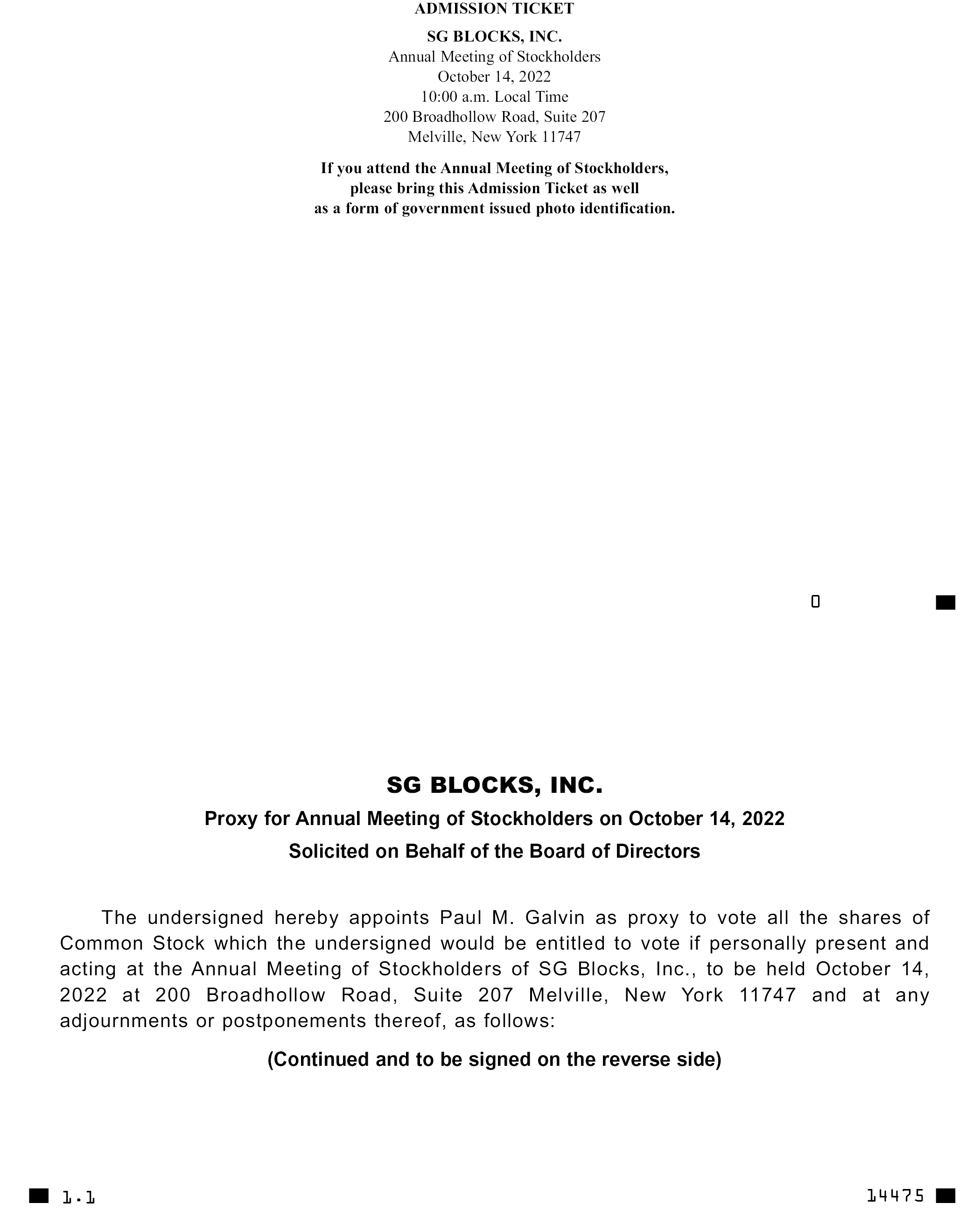 ADMISSION TICKET SG BLOCKS, INC. Annual Meeting of Stockholders October 14, 2022 10:00 a.m. Local Time 200 Broadhollow Road, Suite 207 Melville, New York 11747 If you attend the Annual Meeting of Stockholders, please bring this Admission Ticket as well as a form of government issued photo identification. SG BLOCKS, INC. Proxy for Annual Meeting of Stockholders on October 14, 2022 Solicited on Behalf of the Board of Directors The undersigned hereby appoints Paul M. Galvin as proxy to vote all the shares of Common Stock which the undersigned would be entitled to vote if personally present and acting at the Annual Meeting of Stockholders of SG Blocks, Inc., to be held October 14, 2022 at 200 Broadhollow Road, Suite 207 Melville, New York 11747 and at any adjournments or postponements thereof, as follows: (Continued and to be signed on the reverse side) 1.1 14475
