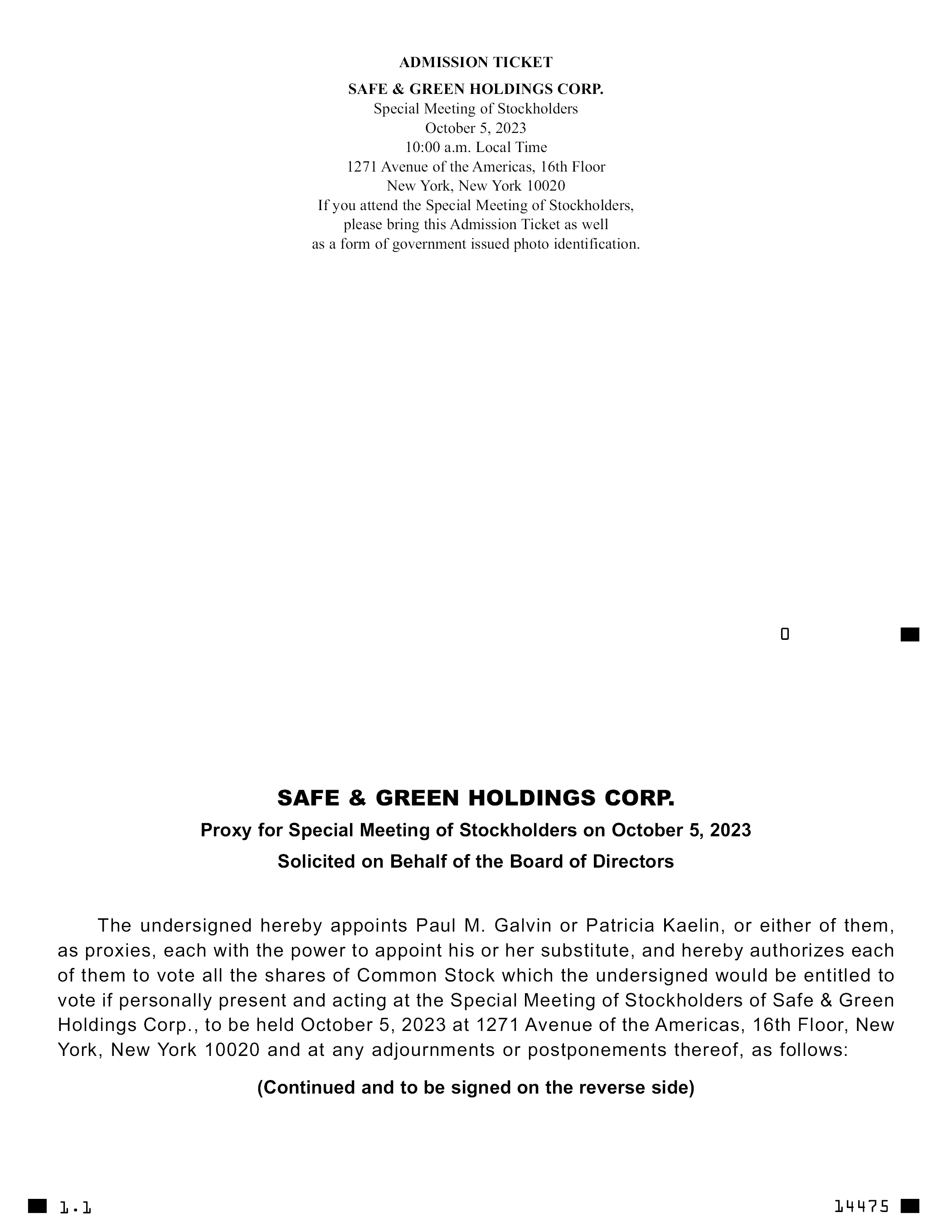 ADMISSION TICKET SAFE & GREEN HOLDINGS CORP. Special Meeting of Stockholders October 5, 2023 10:00 a.m. Local Time 1271 Avenue of the Americas, 16th Floor New York, New York 10020 If you attend the Special Meeting of Stockholders, please bring this Admission Ticket as well as a form of government issued photo identification. SAFE & GREEN HOLDINGS CORP. Proxy for Special Meeting of Stockholders on October 5, 2023 Solicited on Behalf of the Board of Directors The undersigned hereby appoints Paul M. Galvin or Patricia Kaelin, or either of them, as proxies, each with the power to appoint his or her substitute, and hereby authorizes each of them to vote all the shares of Common Stock which the undersigned would be entitled to vote if personally present and acting at the Special Meeting of Stockholders of Safe & Green Holdings Corp., to be held October 5, 2023 at 1271 Avenue of the Americas, 16th Floor, New York, New York 10020 and at any adjournments or postponements thereof, as follows: (Continued and to be signed on the reverse side)