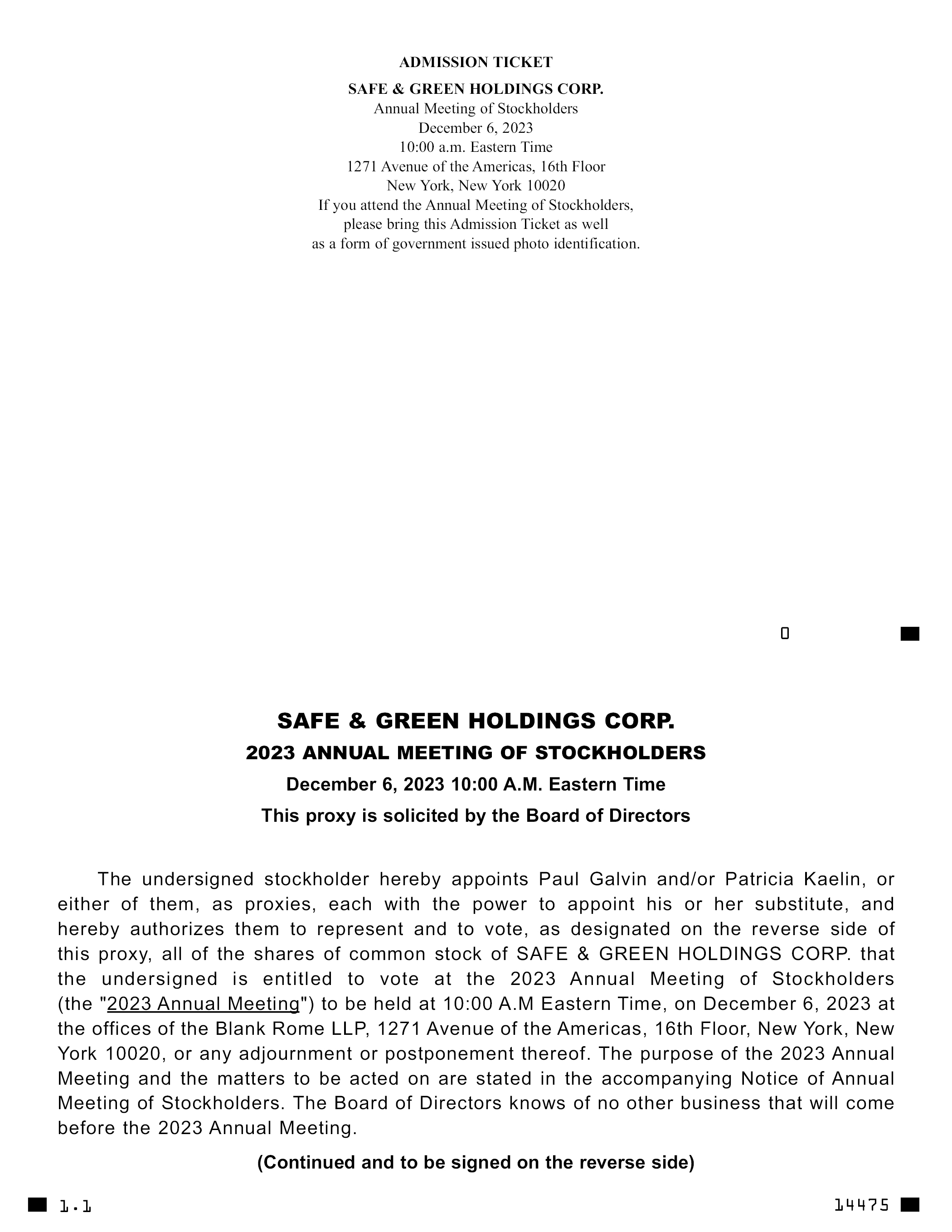 ADMISSION TICKET SAFE & GREEN HOLDINGS CORP. Annual Meeting of Stockholders December 6, 2023 10:00 a.m. Eastern Time 1271 Avenue of the Americas, 16th Floor New York, New York 10020 If you attend the Annual Meeting of Stockholders, please bring this Admission Ticket as well as a form of government issued photo identification. SAFE & GREEN HOLDINGS CORP. 2023 ANNUAL MEETING OF STOCKHOLDERS December 6, 2023 10:00 A.M. Eastern Time This proxy is solicited by the Board of Directors The undersigned stockholder hereby appoints Paul Galvin and/or Patricia Kaelin, or either of them, as proxies, each with the power to appoint his or her substitute, and hereby authorizes them to represent and to vote, as designated on the reverse side of this proxy, all of the shares of common stock of SAFE & GREEN HOLDINGS CORP. that the undersigned is entitled to vote at the 2023 Annual Meeting of Stockholders (the “2023 Annual Meeting”) to be held at 10:00 A.M Eastern Time, on December 6, 2023 at the offices of the Blank Rome LLP, 1271 Avenue of the Americas, 16th Floor, New York, New York 10020, or any adjournment or postponement thereof. The purpose of the 2023 Annual Meeting and the matters to be acted on are stated in the accompanying Notice of Annual Meeting of Stockholders. The Board of Directors knows of no other business that will come before the 2023 Annual Meeting. (Continued and to be signed on the reverse side) 1.1 14475