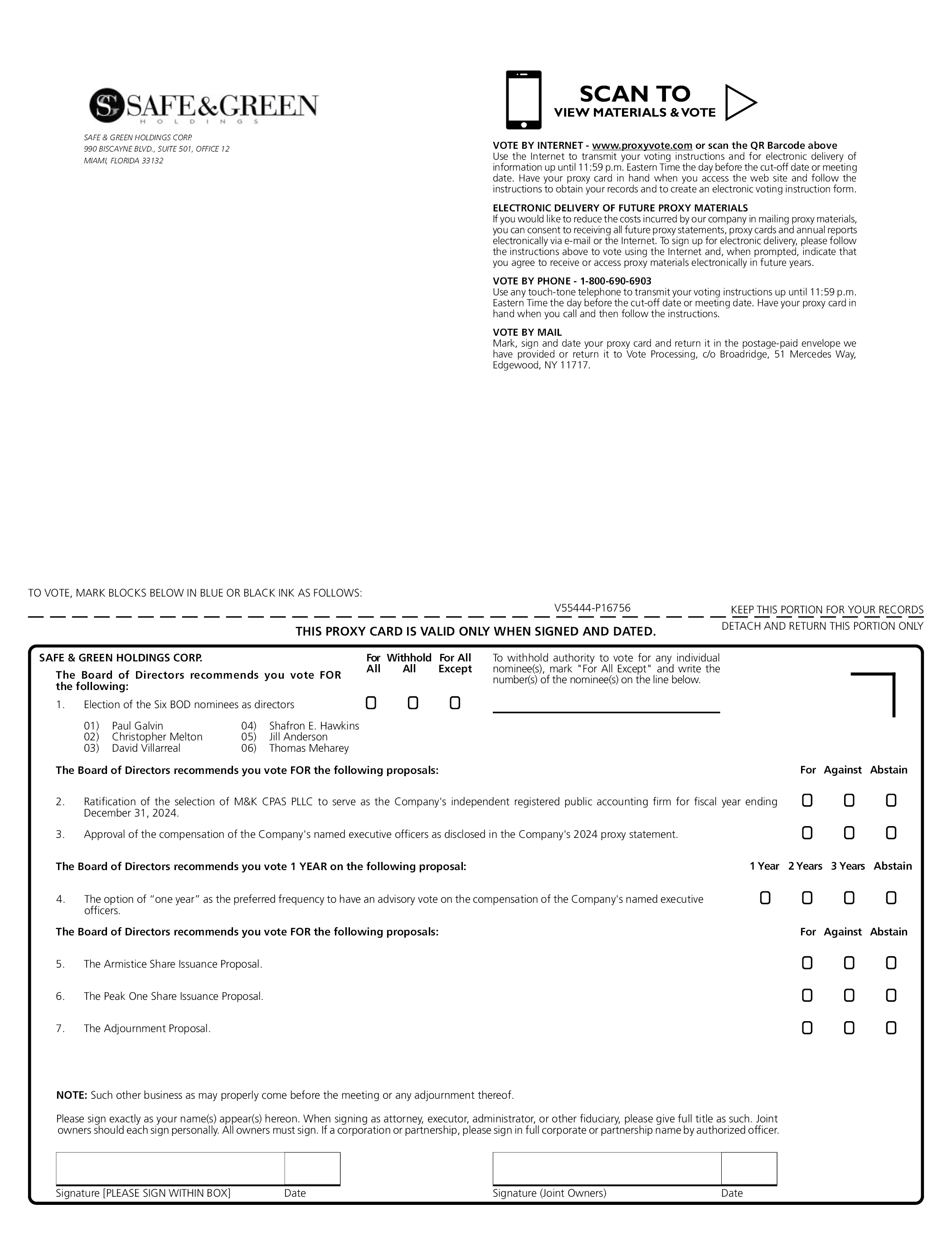 SAFE & GREEN HOLDINGS CORP. 990 BISCAYNE BLVD., SUITE 501, OFFICE 12 MIAMI, FLORIDA 33132 SCAN TO VIEW MATERIALS & VOTE VOTE BY INTERNET www.proxyvote.com or scan the QR Barcode above Use the Internet to transmit your voting instructions and for electronic delivery of information up until 11:59 p.m. Eastern Time the day before the cut-off date or meeting date. Have your proxy card in hand when you access the web site and follow the instructions to obtain your records and to create an electronic voting instruction form. ELECTRONIC DELIVERY OF FUTURE PROXY MATERIALS If you would like to reduce the costs incurred by our company in mailing proxy materials, you can consent to receiving all future proxy statements, proxy cards and annual reports electronically via e-mail or the Internet. To sign up for electronic delivery, please follow the instructions above to vote using the Internet and, when prompted, indicate that you agree to receive or access proxy materials electronically in future years. VOTE BY PHONE - 1-800-690-6903 Use any touch-tone telephone to transmit your voting instructions up until 11:59 p.m. Eastern Time the day before the cut-off date or meeting date. Have your proxy card in hand when you call and then follow the instructions. VOTE BY MAIL Mark, sign and date your proxy card and return it in the postage-paid envelope we have provided or return it to Vote Processing, c/o Broadridge, 51 Mercedes Way, Edgewood, NY 11717. TO VOTE, MARK BLOCKS BELOW IN BLUE OR BLACK INK AS FOLLOWS: V55444-P16756 KEEP THIS PORTION FOR YOUR RECORDS THIS PROXY CARD IS VALID ONLY WHEN SIGNED AND DATED. DETACH AND RETURN THIS PORTION ONLY SAFE & GREEN HOLDINGS CORP. The Board of Directors recommends you vote FOR the following: 1. Election of the Six BOD nominees as directors 01) Paul Galvin 02) Christopher Melton 03) David Villarreal 04) Shafron E. Hawkins 05) Jill Anderson 06) Thomas Meharey The Board of Directors recommends you vote FOR the following proposals: 2. Ratification of the selection of M&K CPAS PLLC to serve as the Company’s independent registered public accounting firm for fiscal year ending December 31, 2024. 3. Approval of the compensation of the Company’s named executive officers as disclosed in the Company’s 2024 proxy statement. The Board of Directors recommends you vote 1 YEAR on the following proposal: 4. The option of “one year” as the preferred frequency to have an advisory vote on the compensation of the Company’s named executive officers. The Board of Directors recommends you vote FOR the following proposals: 5. The Armistice Share Issuance Proposal. 6. The Peak One Share Issuance Proposal. 7. The Adjournment Proposal. For All Withhold All For All Except To withhold authority to vote for any individual nominee(s), mark “For All Except” and write the number(s) of the nominee(s) on the line below. For Against Abstain 1 Year 2 Years 3 Years Abstain For Against Abstain NOTE: Such other business as may properly come before the meeting or any adjournment thereof. Please sign exactly as your name(s) appear(s) hereon. When signing as attorney, executor, administrator, or other fiduciary, please give full title as such. Joint owners should each sign personally. All owners must sign. If a corporation or partnership, please sign in full corporate or partnership name by authorized officer. Signature [PLEASE SIGN WITHIN BOX] Date Signature (Joint Owners) Date