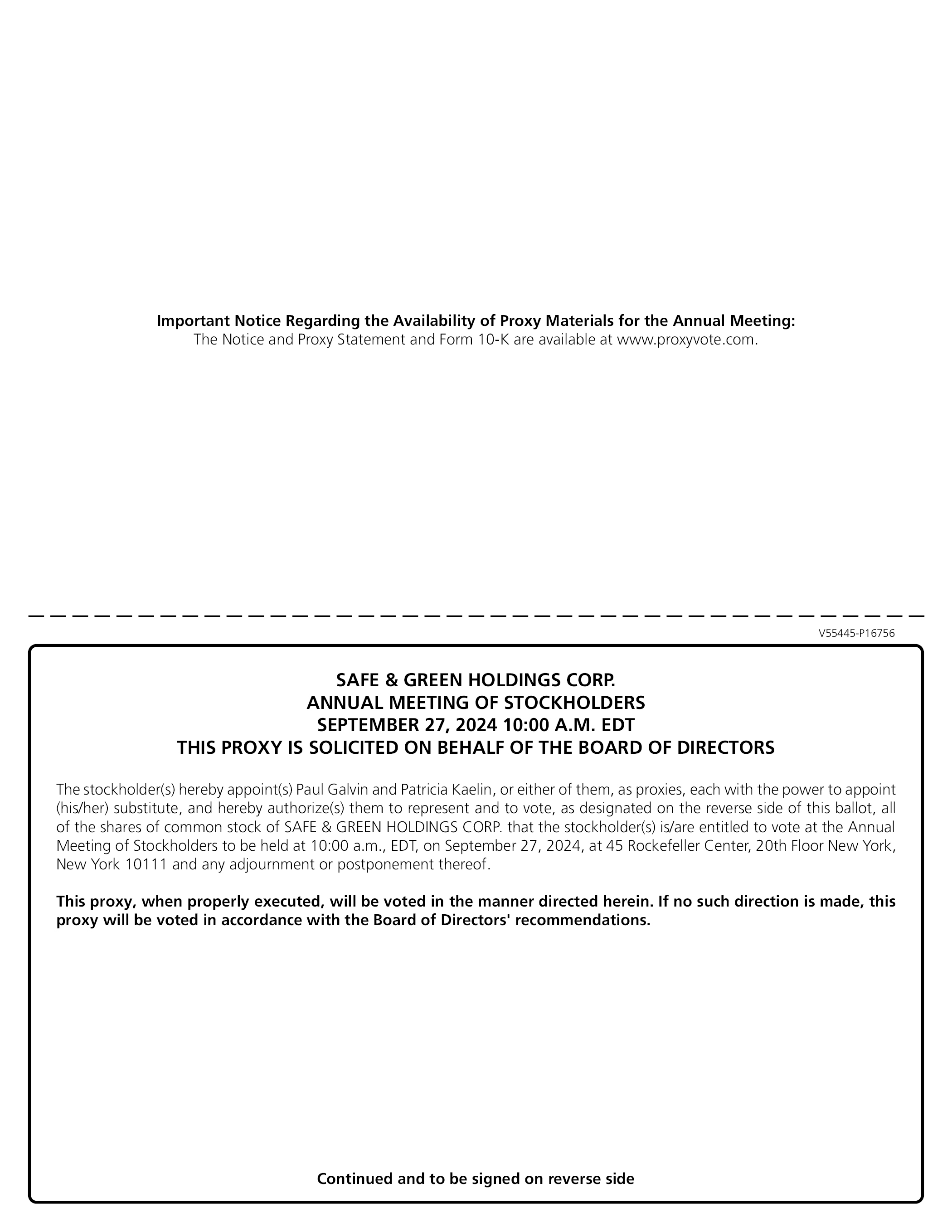 YOUR VOTE IS IMPORTANT. WHETHER OR NOT YOU PLAN TO ATTEND THE 2024 ANNUAL MEETING, PLEASE SUBMIT A PROXY TO HAVE YOUR SHARES VOTED AS PROMPTLY AS POSSIBLE BY SUBMITTING A PROXY VIA THE INTERNET OR TELEPHONE OR BY REQUESTING A PRINTED COPY OF THE PROXY MATERIALS AND SIGNING, DATING AND RETURNING BY MAIL THE PROXY CARD ENCLOSED THEREIN. IF YOU WOULD LIKE TO SUBMIT A PROXY BY MAIL, YOU MAY REQUEST A PRINTED COPY OF THE PROXY MATERIALS (INCLUDING THE PROXY) BY CONTACTING THE CORPORATE SECRETARY, SAFE & GREEN HOLDINGS CORP., 990 BISCAYNE BLVD., SUITE 501, OFFICE 12, MIAMI, FLORIDA 33132, OR BY PHONE AT (646) 240-4235 AND SUCH MATERIALS WILL BE SENT TO YOU.