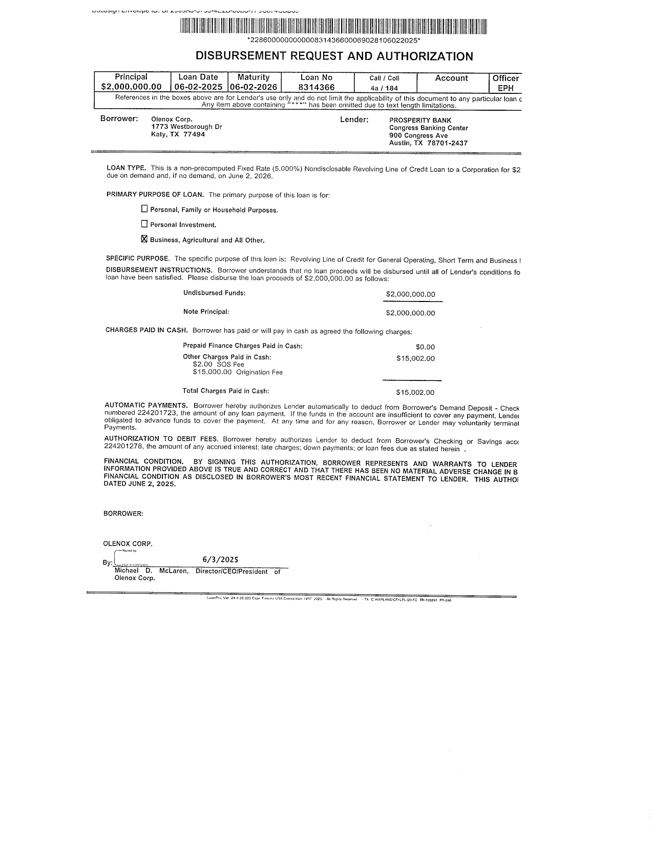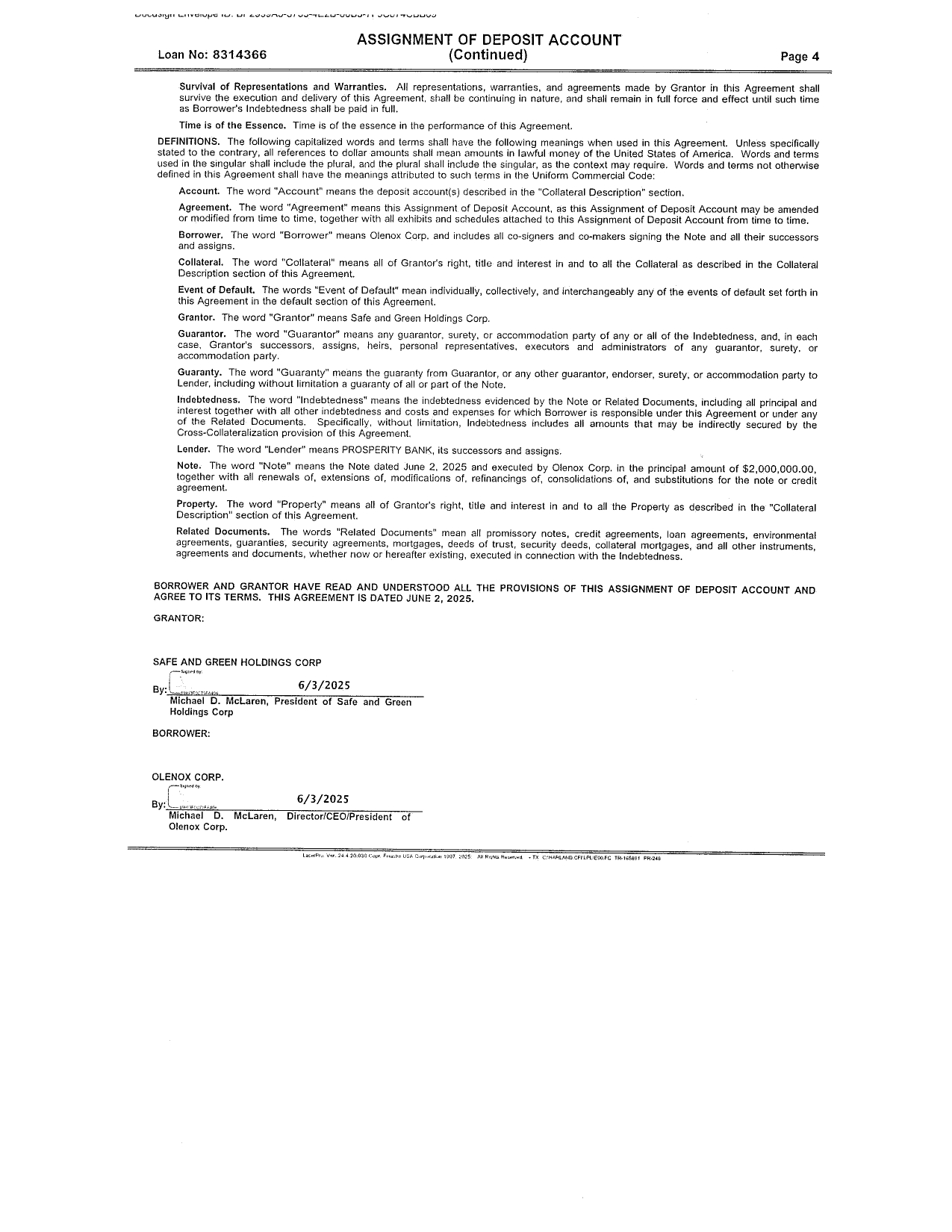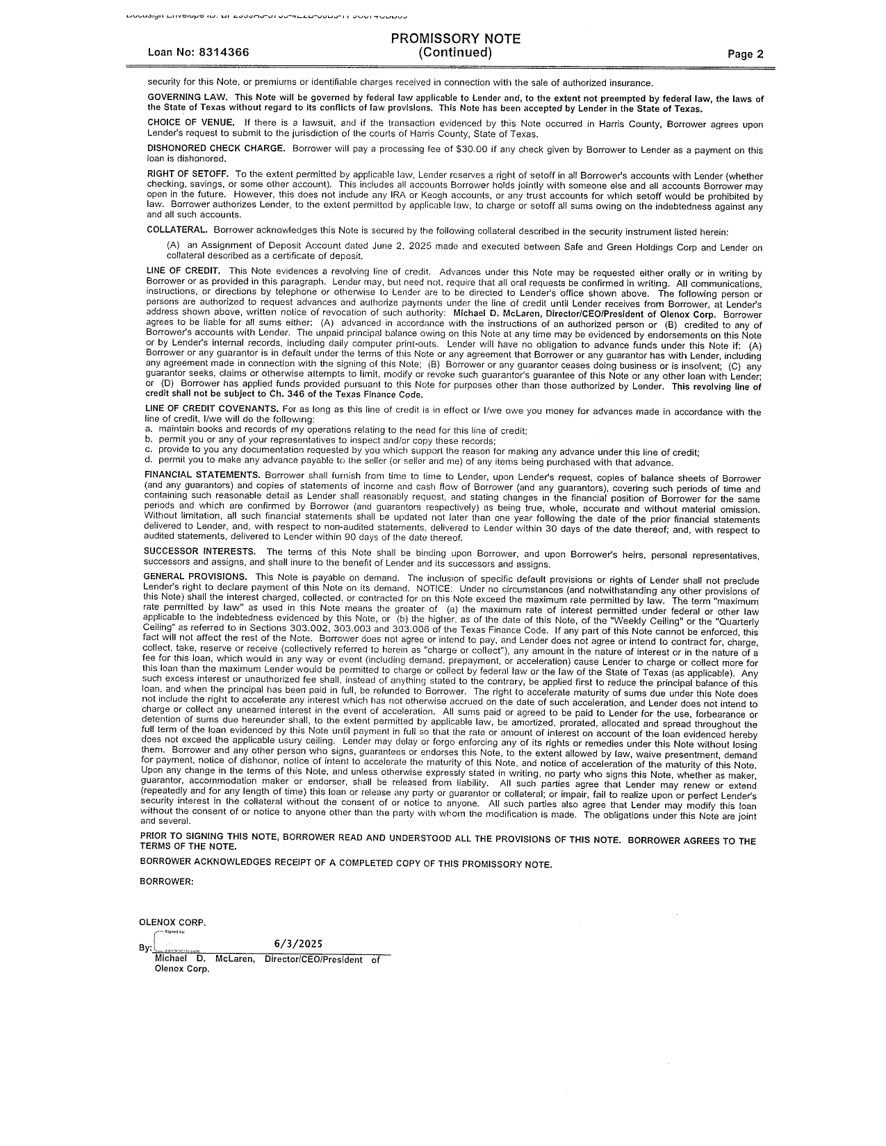 The Note shall bear interest at a rate of five percent (5%) per annum. Interest shall be calculated based on a year of 360 days. The Note shall be due in full immediately upon Lender’s demand. If no demand is made, Borrower will pay all outstanding principal and all accrued unpaid interest on June 2, 2026. In addition, the Borrower will pay regular monthly payments of all accrued interest due as of each payment date, beginning July 2, 2025. The Borrower may prepay all or a portion of the principal without penalty earlier than it is due. If a payment is 10 days or more late, the Borrower will be charged a late charge 5.00% of the unpaid portion of the regular payment. The Lender reserves a right of setoff in all of the Borrower’s accounts with the Lender (whether checking, savings, or some other account). The Borrower authorizes the Lender, to the extent permitted by applicable law, to charge or setoff all sums owing on the indebtedness against any and all such accounts. The Note provides for a commercial guaranty by Michael McLaren.