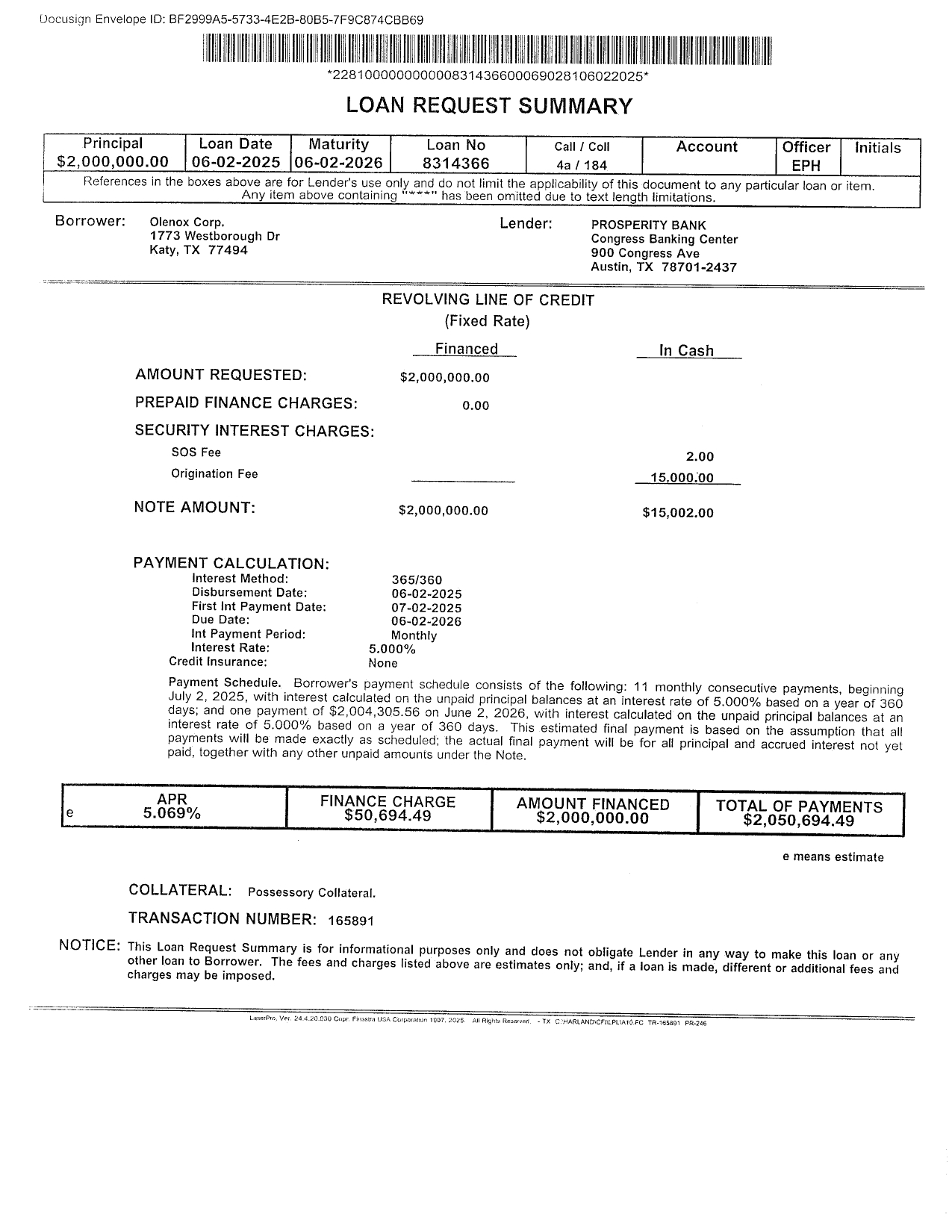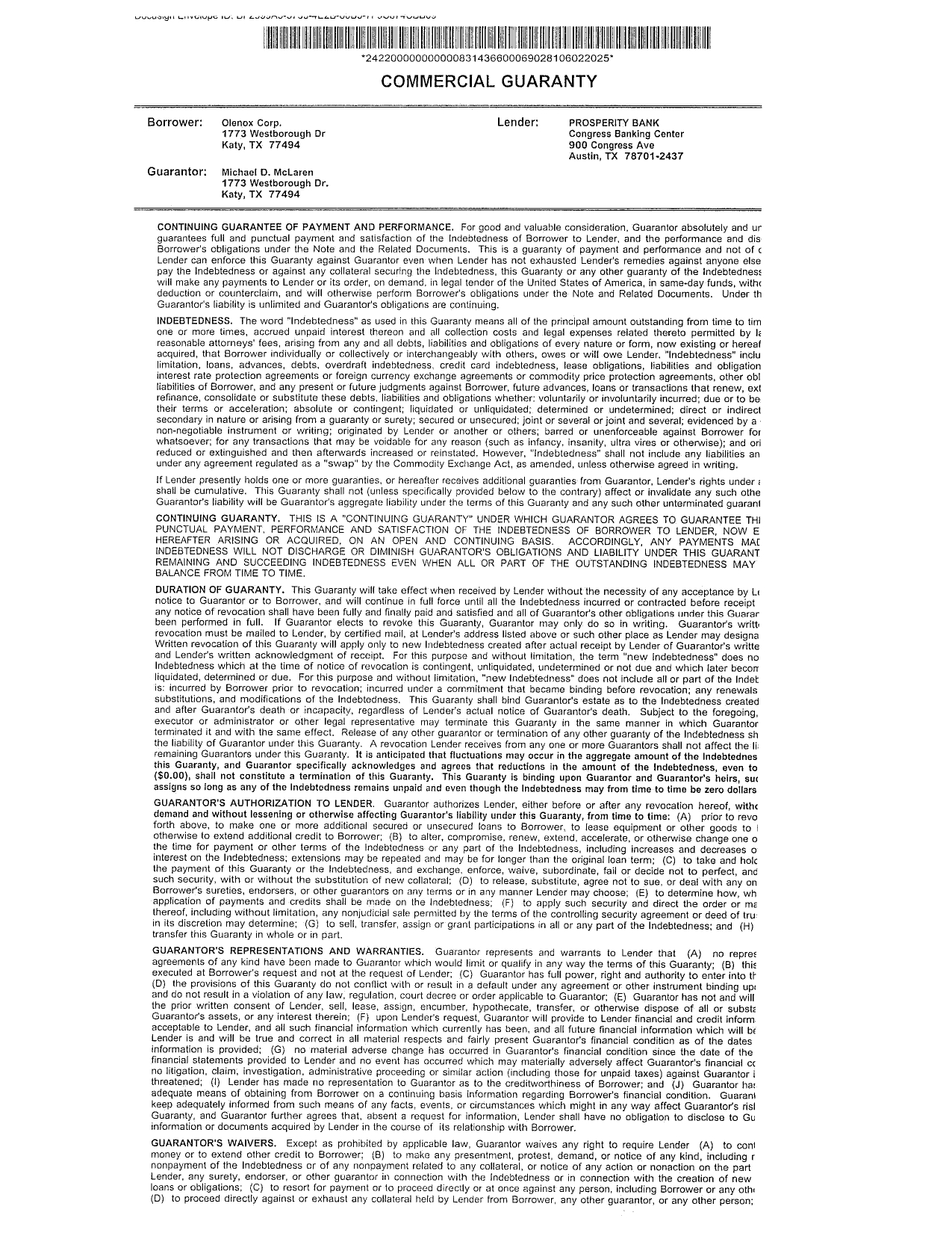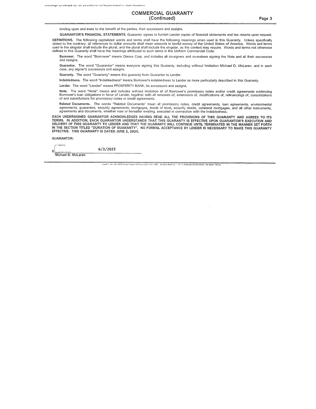 The Note shall bear interest at a rate of five percent (5%) per annum. Interest shall be calculated based on a year of 360 days. The Note shall be due in full immediately upon Lender’s demand. If no demand is made, Borrower will pay all outstanding principal and all accrued unpaid interest on June 2, 2026. In addition, the Borrower will pay regular monthly payments of all accrued interest due as of each payment date, beginning July 2, 2025. The Borrower may prepay all or a portion of the principal without penalty earlier than it is due. If a payment is 10 days or more late, the Borrower will be charged a late charge 5.00% of the unpaid portion of the regular payment. The Lender reserves a right of setoff in all of the Borrower’s accounts with the Lender (whether checking, savings, or some other account). The Borrower authorizes the Lender, to the extent permitted by applicable law, to charge or setoff all sums owing on the indebtedness against any and all such accounts. The Note provides for a commercial guaranty by Michael McLaren.