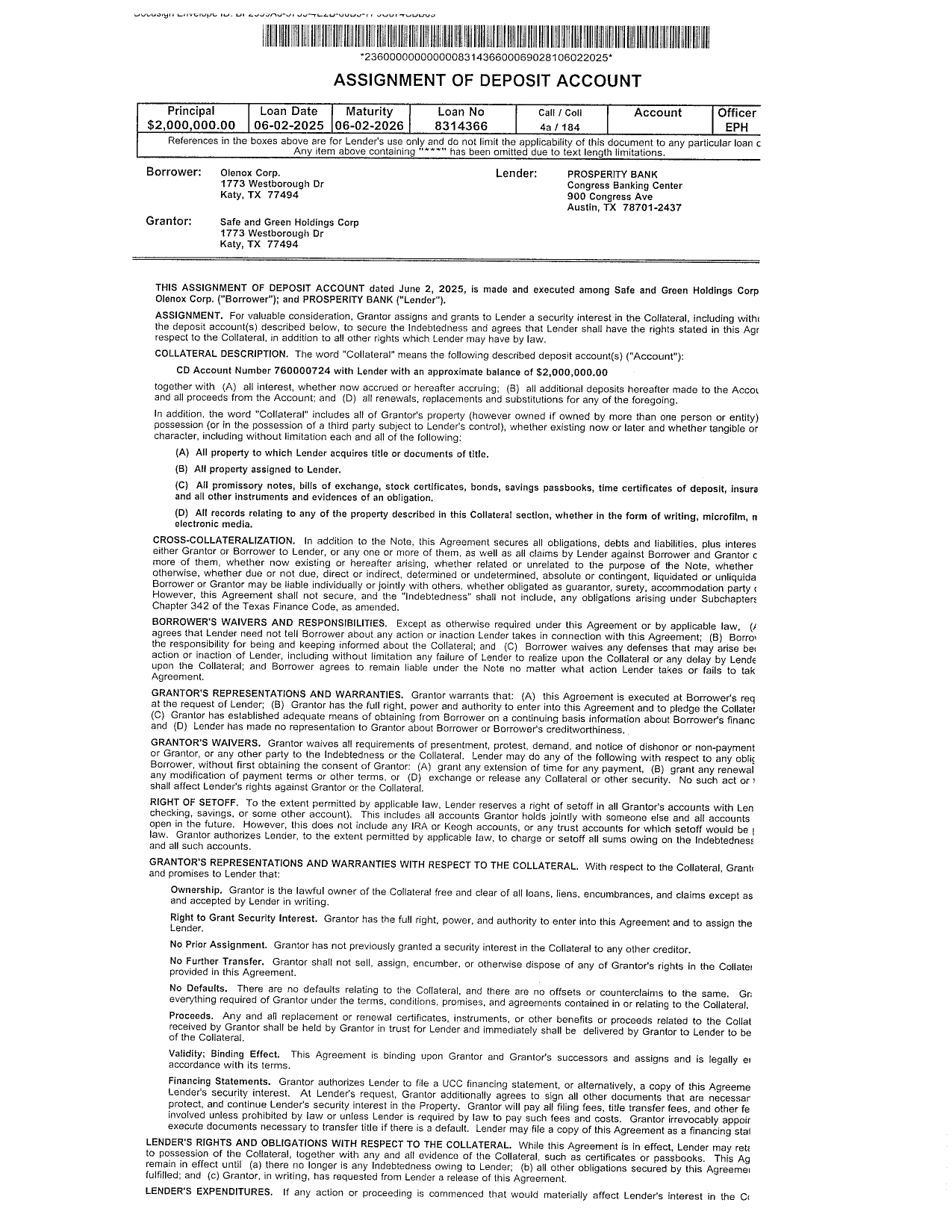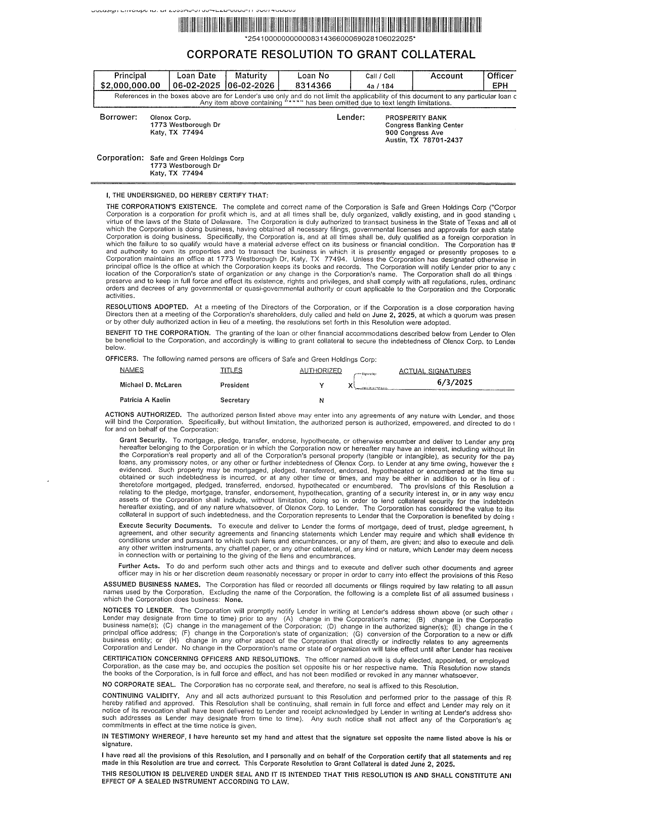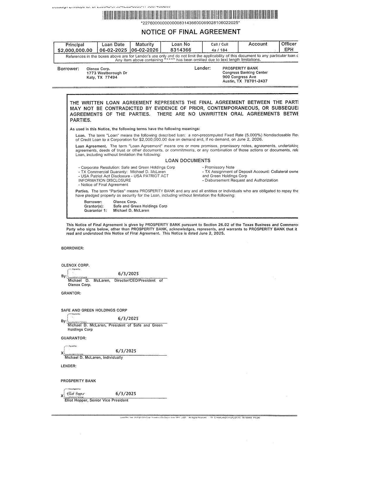 On June 3, 2025 (the “Effective Date”), Olenox Corp. (the “Borrower”), a wholly owned subsidiary of Safe & Green Holdings Corp. (the “Company”), entered into a Promissory Note (the “Note”) in favor of Prosperity Bank (the “Lender”) in the aggregate principal amount of $2,000,000 (the “Principal”). The Note evidences a revolving Line of Credit of Olenox with the Lender. After all loan processing and origination fees of $15,002, the Borrower received net loan proceeds of $1,984,998. The Note is secured by the Company’s Certificate of Deposit held with the Lender with an approximate balance of $2,000,000