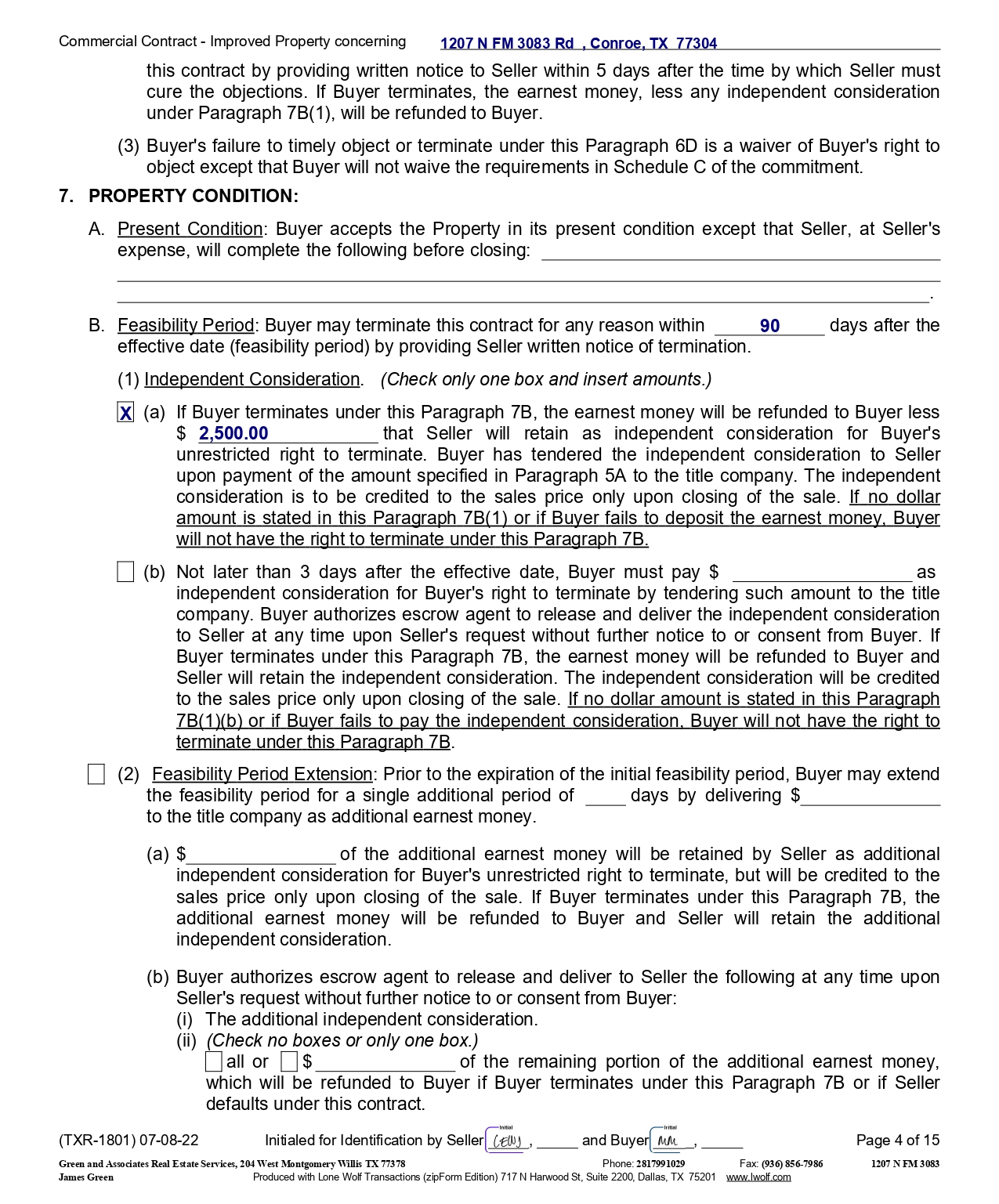 Commercial Contract - Improved Property concerning this contract by providing written notice to Seller within 5 days after the time by which Seller must cure the objections . If Buyer terminates, the earnest money, less any independent consideration under Paragraph 7 B( 1 ), will be refunded to Buyer . (3) Buyer's failure to timely object or terminate under this Paragraph 6D is a waiver of Buyer's right to object except that Buyer will not waive the requirements in Schedule C of the commitment. 7. PROPERTY CONDITION: A. Present Condition : Buyer accepts the Property in its present condition except that Seller, at Seller's expense, will complete the following before closing: . Feasibility Period : Buyer may terminate this contract for any reason within 90 days after the effective date (feasibility period) by providing Seller written notice of termination. (1) Independent Consideration . (Check only one box and insert amounts.) B. (a) If Buyer terminates under this Paragraph 7 B, the earnest money will be refunded to Buyer less $ 2 , 500 . 00 that Seller will retain as independent consideration for Buyer's unrestricted right to terminate . Buyer has tendered the independent consideration to Seller upon payment of the amount specified in Paragraph 5 A to the title company . The independent consideration is to be credited to the sales price only upon closing of the sale . If no dollar amount is stated in this Paragraph 7 B( 1 ) or if Buyer fails to deposit the earnest money, Buyer will not have the right to terminate under this Paragraph 7 B . (b) Not later than 3 days after the effective date, Buyer must pay $ as independent consideration for Buyer's right to terminate by tendering such amount to the title company . Buyer authorizes escrow agent to release and deliver the independent consideration to Seller at any time upon Seller's request without further notice to or consent from Buyer . If Buyer terminates under this Paragraph 7 B, the earnest money will be refunded to Buyer and Seller will retain the independent consideration . The independent consideration will be credited to the sales price only upon closing of the sale . If no dollar amount is stated in this Paragraph 7 B( 1 )(b) or if Buyer fails to pay the independent consideration, Buyer will not have the right to terminate under this Paragraph 7 B . (2) Feasibility Period Extension : Prior to the expiration of the initial feasibility period, Buyer may extend the feasibility period for a single additional period of days by delivering $ to the title company as additional earnest money . (a) $ of the additional earnest money will be retained by Seller as additional independent consideration for Buyer's unrestricted right to terminate, but will be credited to the sales price only upon closing of the sale . If Buyer terminates under this Paragraph 7 B, the additional earnest money will be refunded to Buyer and Seller will retain the additional independent consideration . (b) Buyer authorizes escrow agent to release and deliver to Seller the following at any time upon Seller's request without further notice to or consent from Buyer : (i) The additional independent consideration. (ii) (Check no boxes or only one box.) all or $ of the remaining portion of the additional earnest money, which will be refunded to Buyer if Buyer terminates under this Paragraph 7 B or if Seller defaults under this contract . 1207 N FM 3083 Rd , Conroe, TX 77304 X (TXR - 1801) 07 - 08 - 22 Initialed for Identification by Seller , and Buyer , Page 4 of 15 1207 N FM 3083 Green and Associates Real Estate Services, 204 West Montgomery Willis TX 77378 Phone: 2817991029 Fax: (936) 856 - 7986 James Green Produced with Lone Wolf Transactions (zipForm Edition) 717 N Harwood St, Suite 2200, Dallas, TX 75201 www.lwolf.com