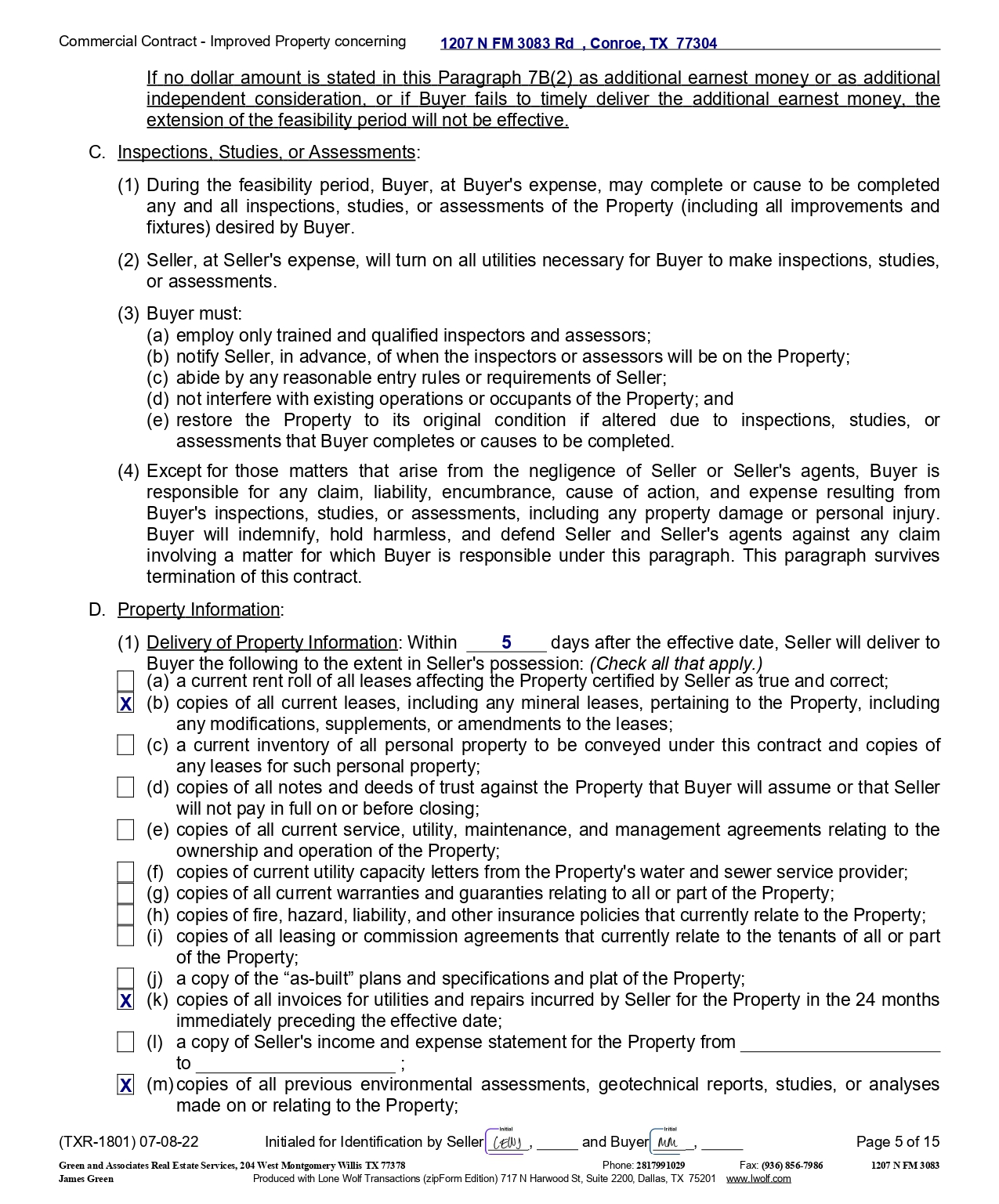 Commercial Contract - Improved Property concerning Buyer the following to the extent in Seller's possession: (Check all that apply.) (a) a current rent roll of all leases affecting the Property certified by Seller as true and correct; (b) copies of all current leases, including any mineral leases, pertaining to the Property, including any modifications, supplements, or amendments to the leases; (c) a current inventory of all personal property to be conveyed under this contract and copies of any leases for such personal property; (d) copies of all notes and deeds of trust against the Property that Buyer will assume or that Seller will not pay in full on or before closing; (e) copies of all current service, utility, maintenance, and management agreements relating to the ownership and operation of the Property; (f) copies of current utility capacity letters from the Property's water and sewer service provider; (g) copies of all current warranties and guaranties relating to all or part of the Property; (h) copies of fire, hazard, liability, and other insurance policies that currently relate to the Property; (i) copies of all leasing or commission agreements that currently relate to the tenants of all or part of the Property; (j) a copy of the “as - built” plans and specifications and plat of the Property; (k) copies of all invoices for utilities and repairs incurred by Seller for the Property in the 24 months immediately preceding the effective date; (l) a copy of Seller's income and expense statement for the Property from to ; (m) copies of all previous environmental assessments, geotechnical reports, studies, or analyses made on or relating to the Property; If no dollar amount is stated in this Paragraph 7 B( 2 ) as additional earnest money or as additional independent consideration, or if Buyer fails to timely deliver the additional earnest money, the extension of the feasibility period will not be effective . C . Inspections, Studies, or Assessments : (1) During the feasibility period, Buyer, at Buyer's expense, may complete or cause to be completed any and all inspections, studies, or assessments of the Property (including all improvements and fixtures) desired by Buyer . (2) Seller, at Seller's expense, will turn on all utilities necessary for Buyer to make inspections, studies, or assessments. (3) Buyer must: (a) employ only trained and qualified inspectors and assessors; (b) notify Seller, in advance, of when the inspectors or assessors will be on the Property; (c) abide by any reasonable entry rules or requirements of Seller; (d) not interfere with existing operations or occupants of the Property; and (e) restore the Property to its original condition if altered due to inspections, studies, or assessments that Buyer completes or causes to be completed. (4) Except for those matters that arise from the negligence of Seller or Seller's agents, Buyer is responsible for any claim, liability, encumbrance, cause of action, and expense resulting from Buyer's inspections, studies, or assessments, including any property damage or personal injury . Buyer will indemnify, hold harmless, and defend Seller and Seller's agents against any claim involving a matter for which Buyer is responsible under this paragraph . This paragraph survives termination of this contract . D . Property Information : (1) Delivery of Property Information : Within 5 days after the effective date, Seller will deliver to 1207 N FM 3083 Rd , Conroe, TX 77304 X X X (TXR - 1801) 07 - 08 - 22 Initialed for Identification by Seller , and Buyer , Page 5 of 15 1207 N FM 3083 Phone: 2817991029 Fax: (936) 856 - 7986 Green and Associates Real Estate Services, 204 West Montgomery Willis TX 77378 James Green Produced with Lone Wolf Transactions (zipForm Edition) 717 N Harwood St, Suite 2200, Dallas, TX 75201 www.lwolf.com